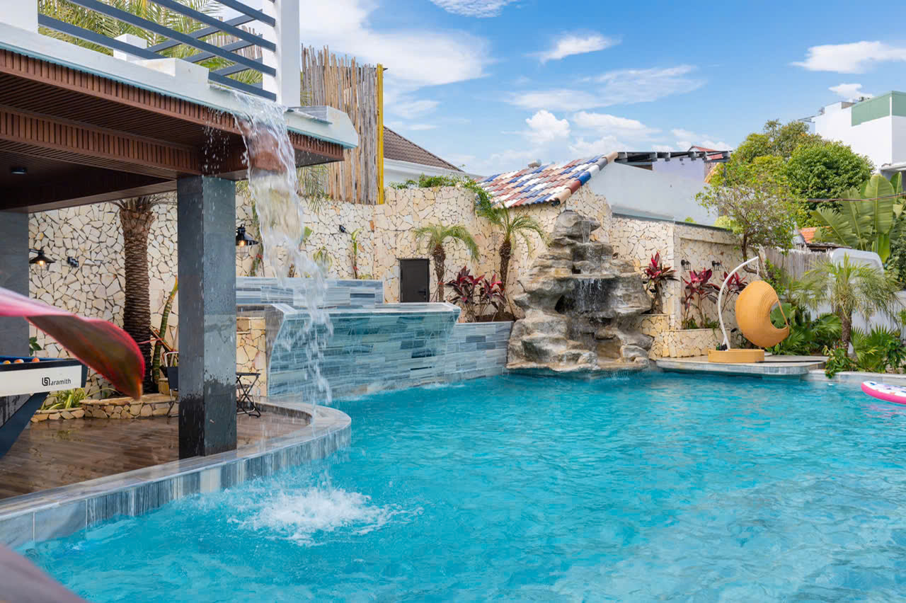 - Hồ bơi: 120m2, siêu rộng, có thể chèo sub, chụp hình sống ảo rất lung linh, có thác nước và sục massage.