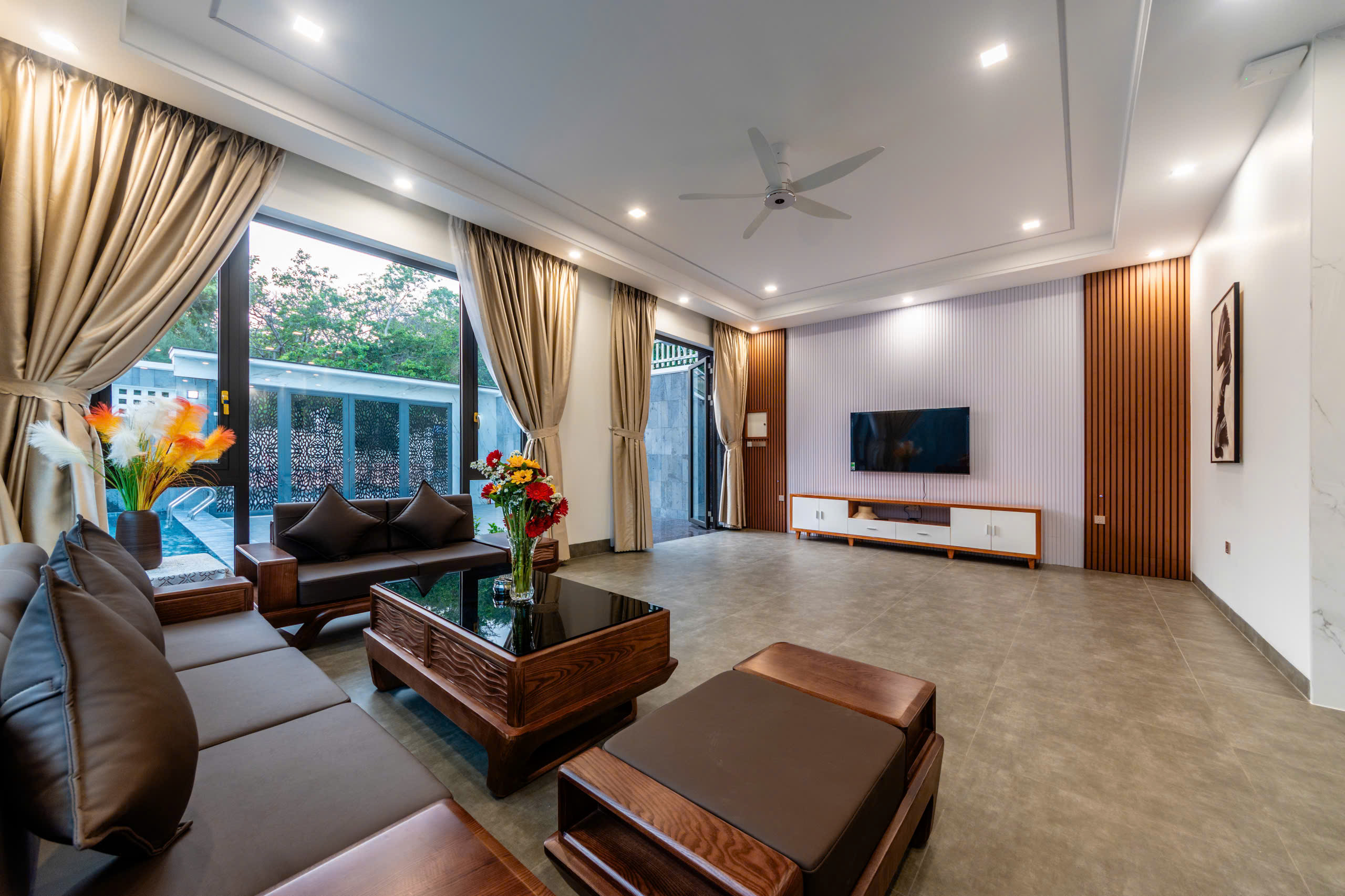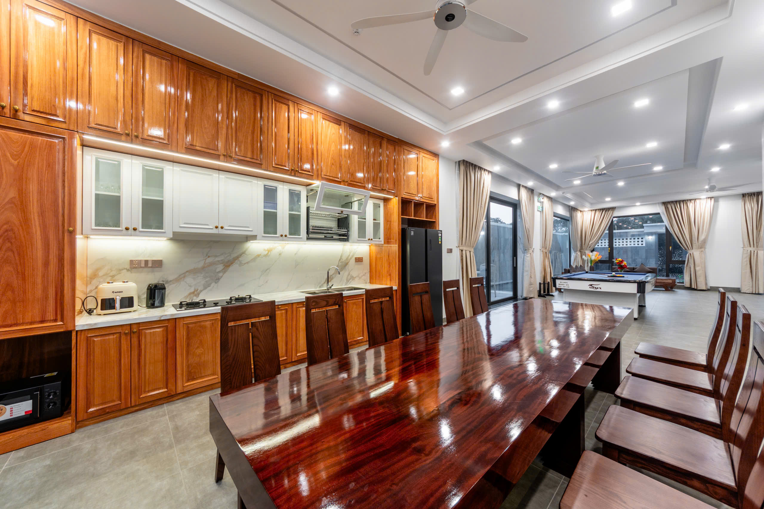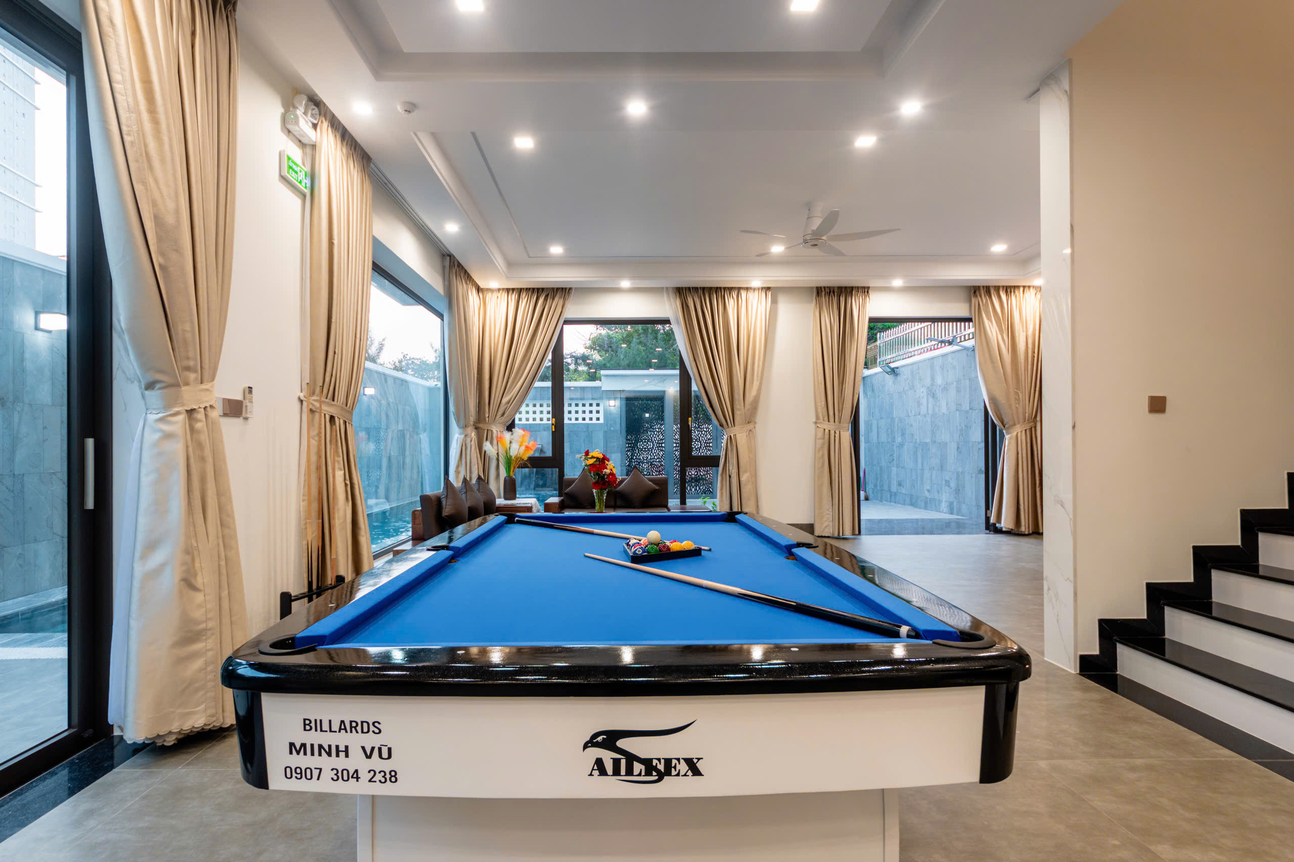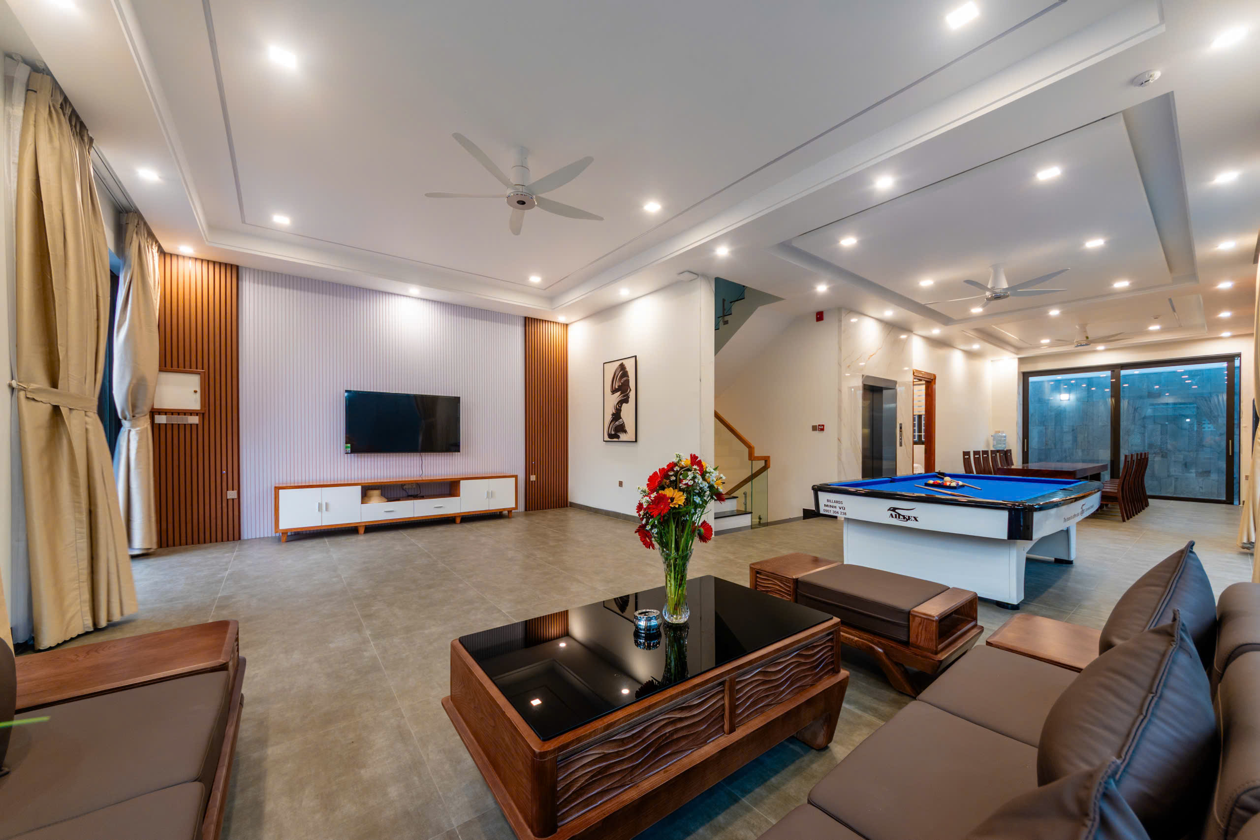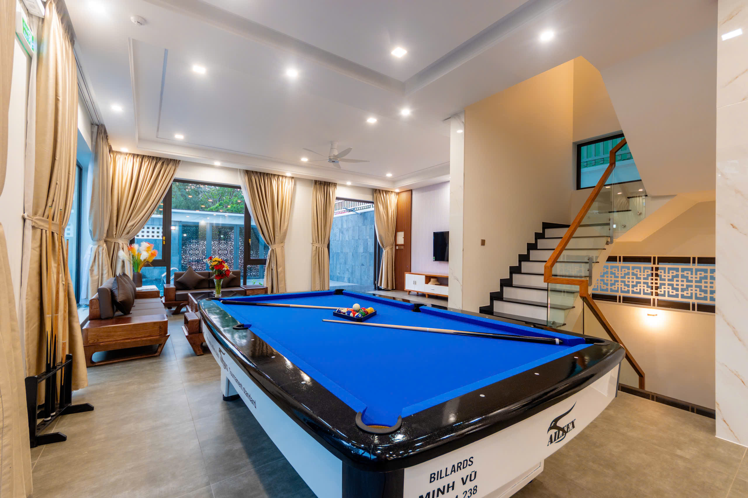 - 1 phòng khách đầy đủ tiện nghi, rộng rãi, có tivi để giải trí và 1 bàn bida lỗ sịn sò