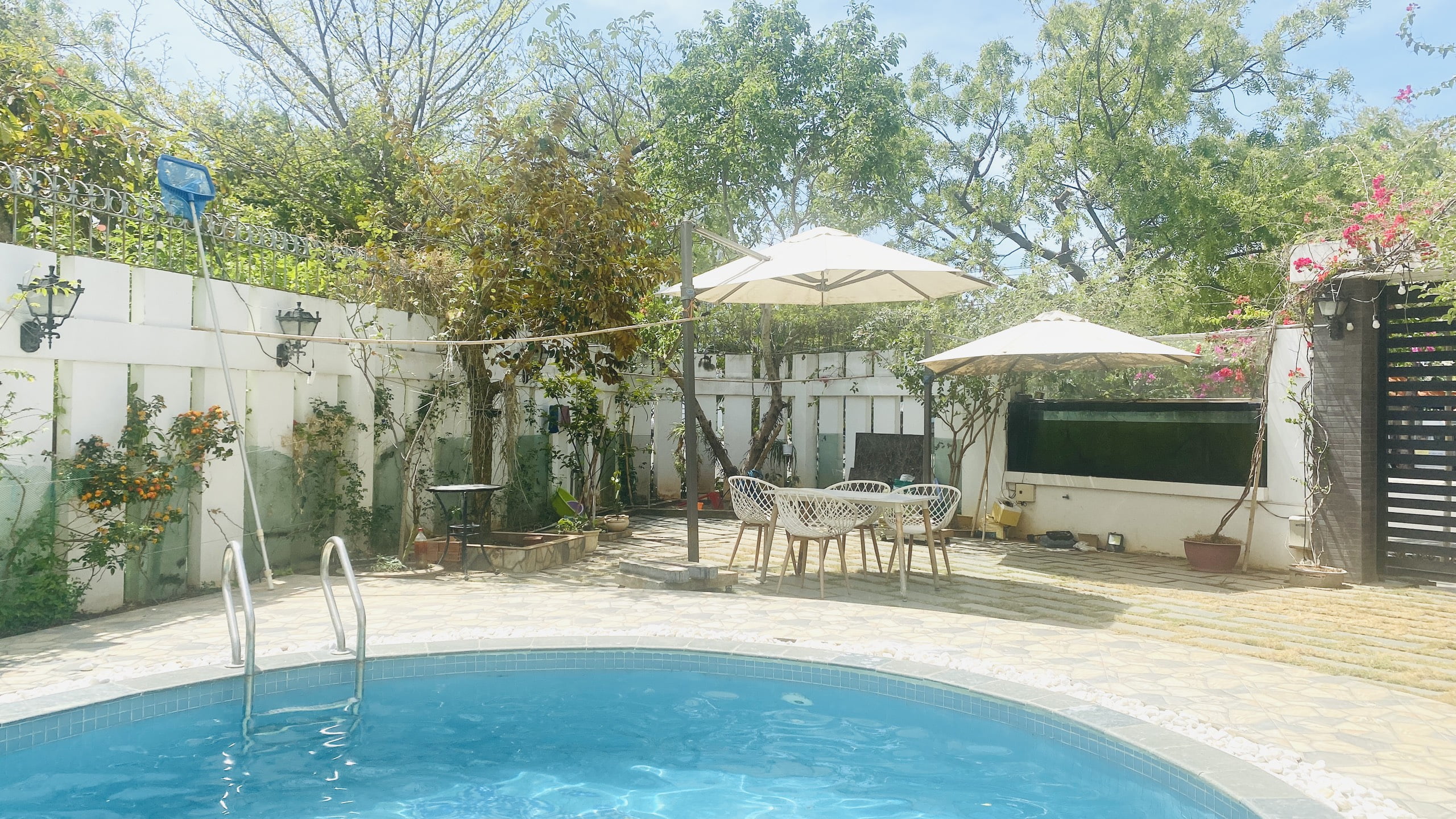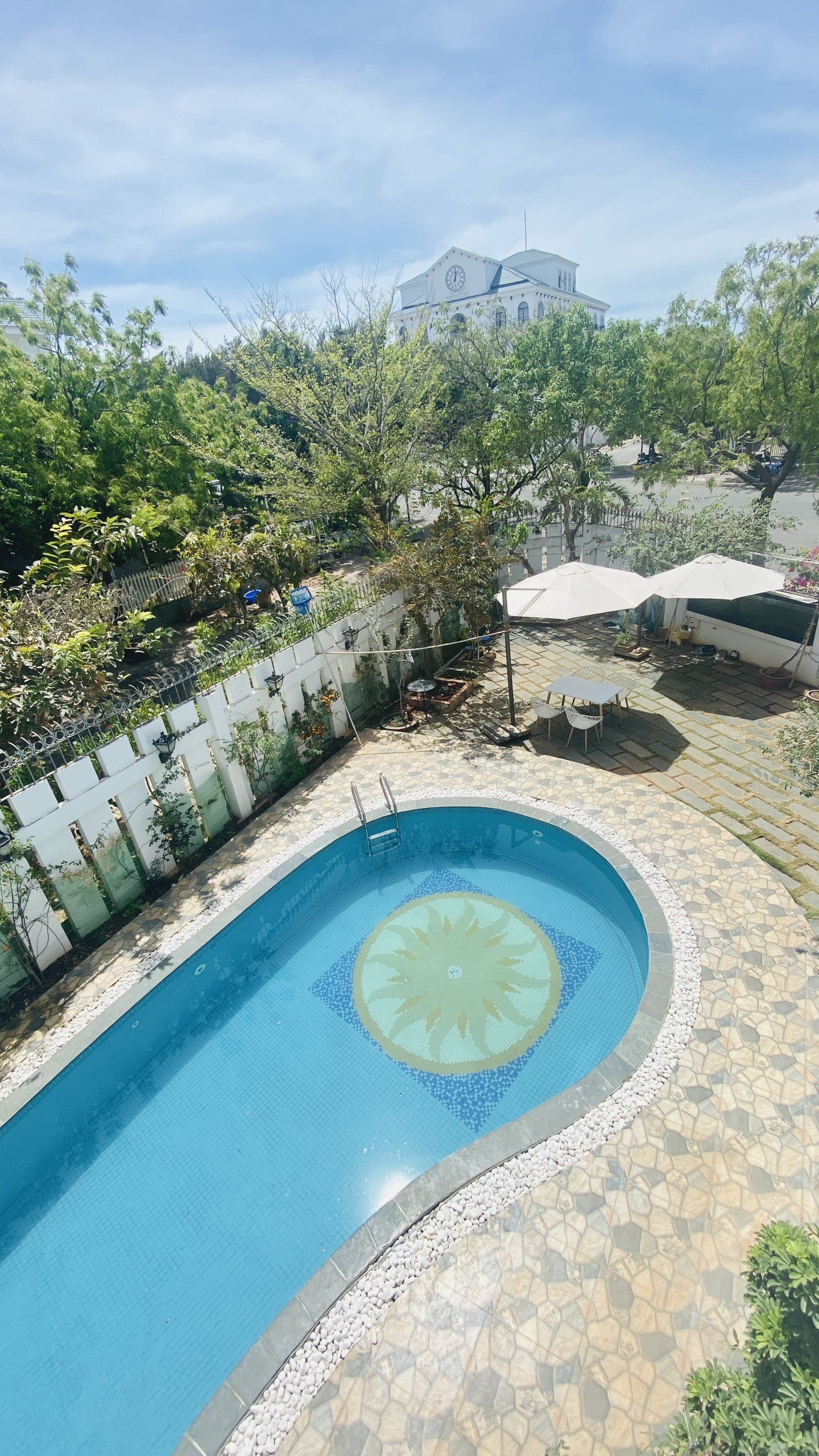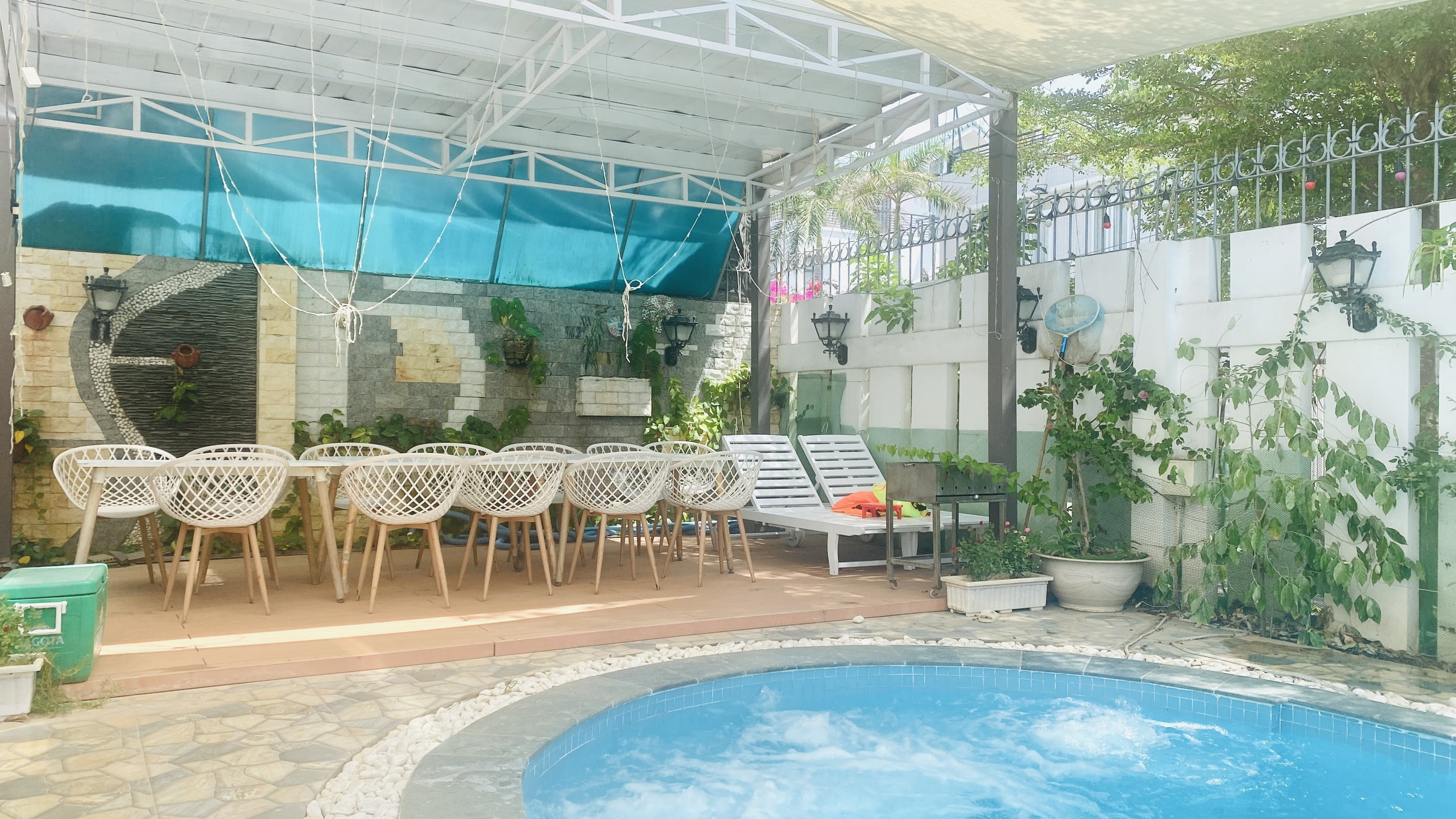 - Hồ bơi lớn nằm ngay sân vườn, kế bên là nơi tổ chức tiệc, có bàn ghế đầy đủ, cả gia đình bạn có thể vừa tắm hồ bơi, vừa thưởng thức những món nướng thơm ngon.