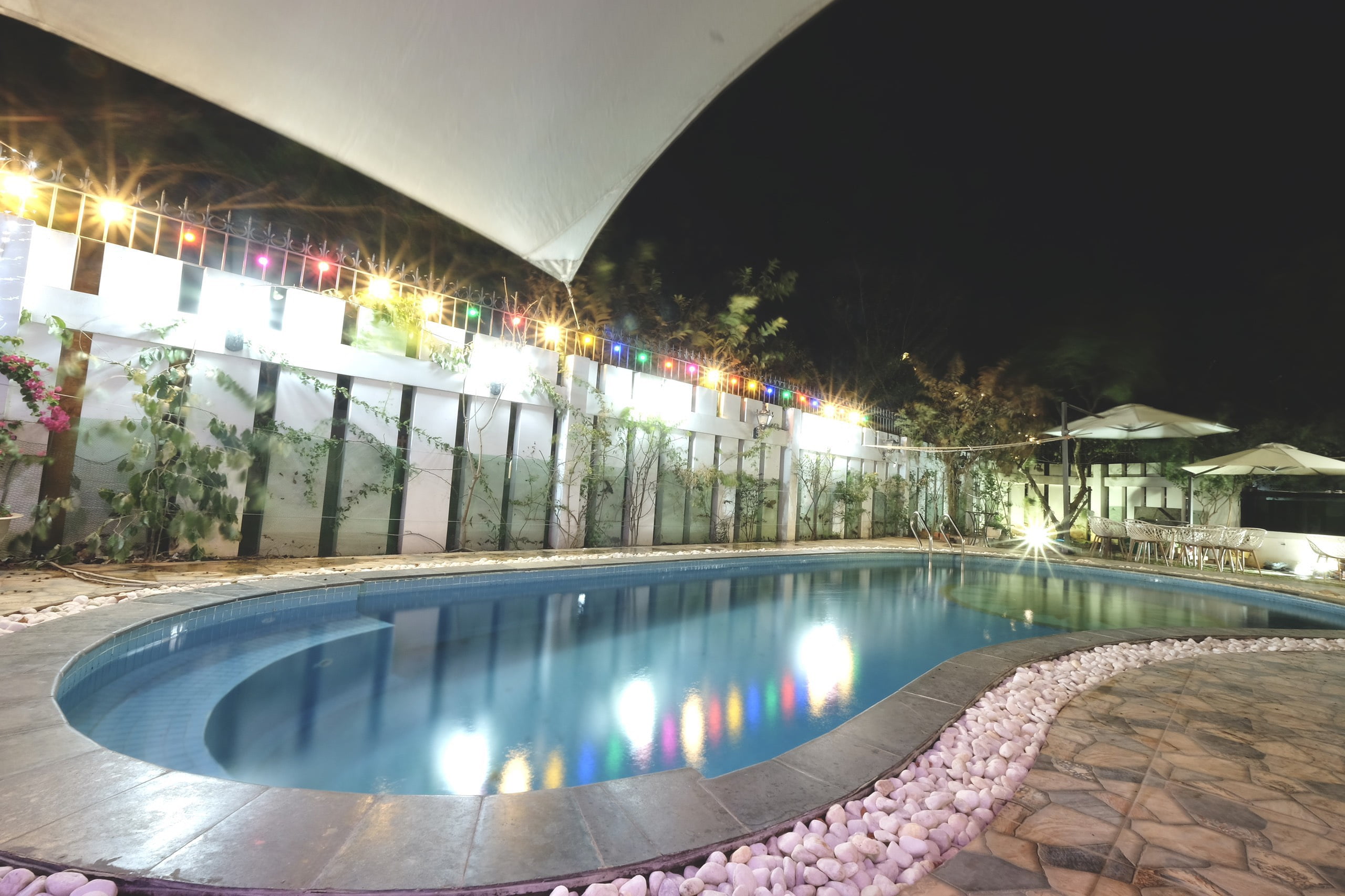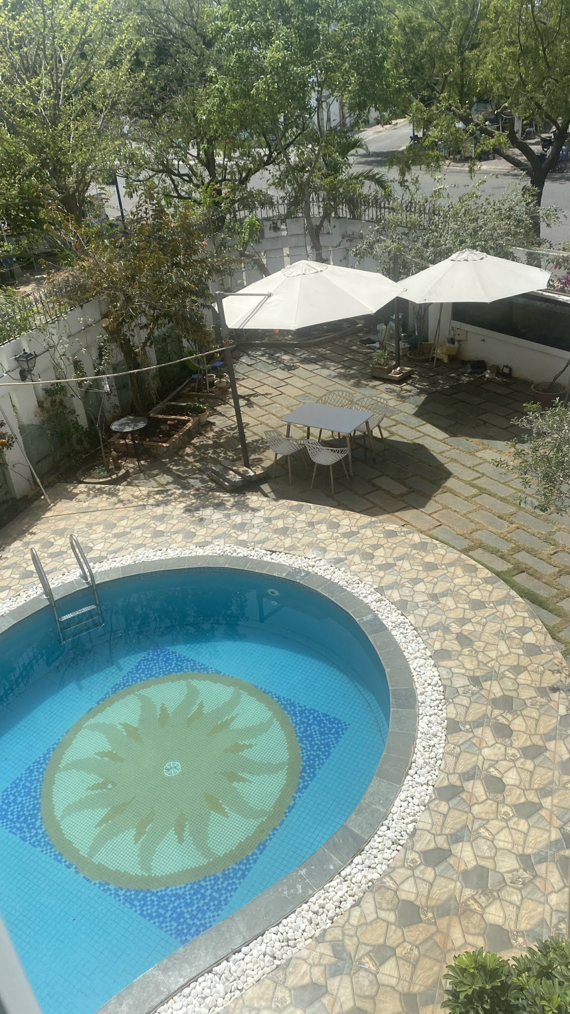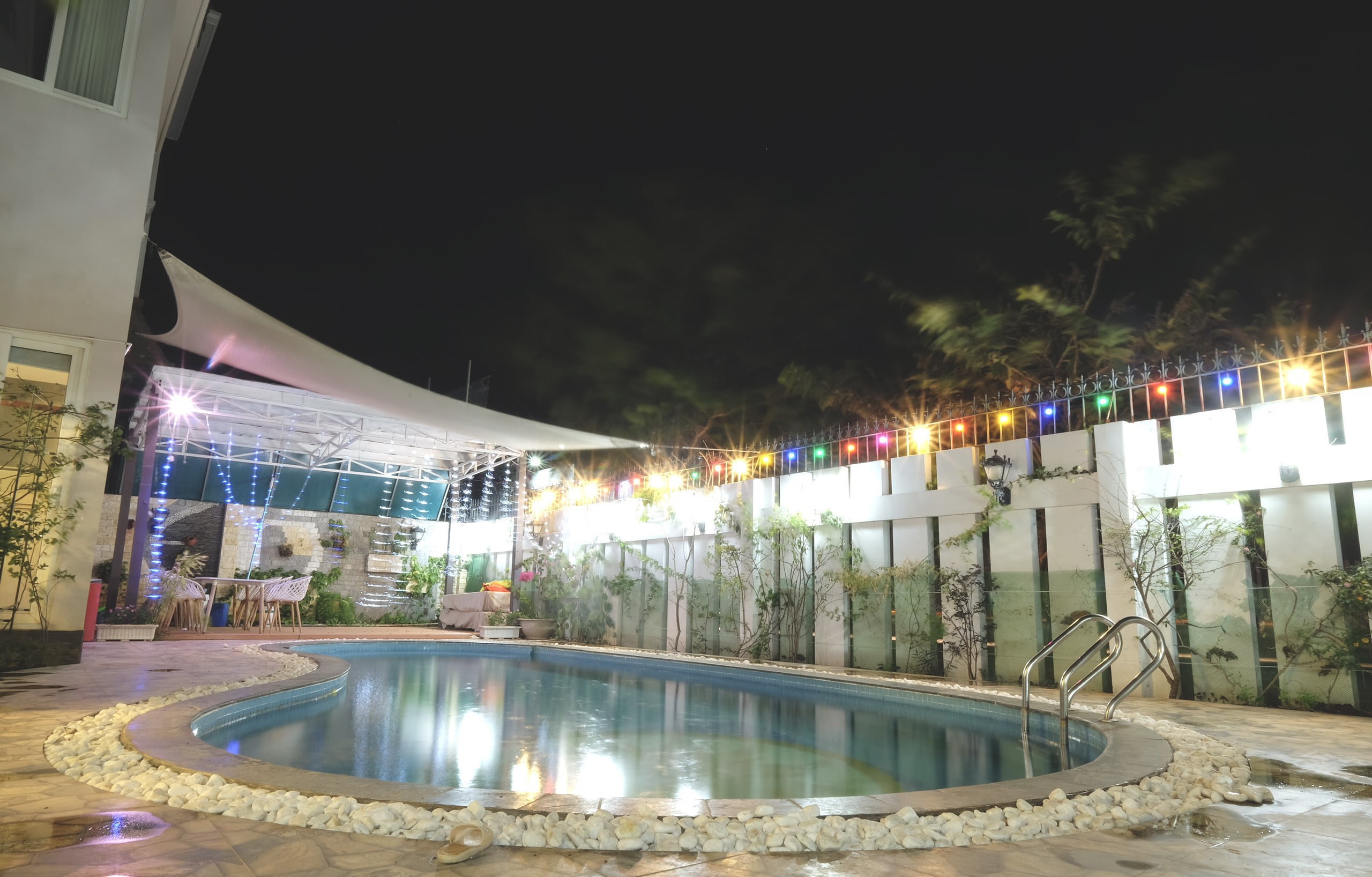 - Hồ bơi lớn nằm ngay sân vườn, kế bên là nơi tổ chức tiệc, có bàn ghế đầy đủ, cả gia đình bạn có thể vừa tắm hồ bơi, vừa thưởng thức những món nướng thơm ngon.