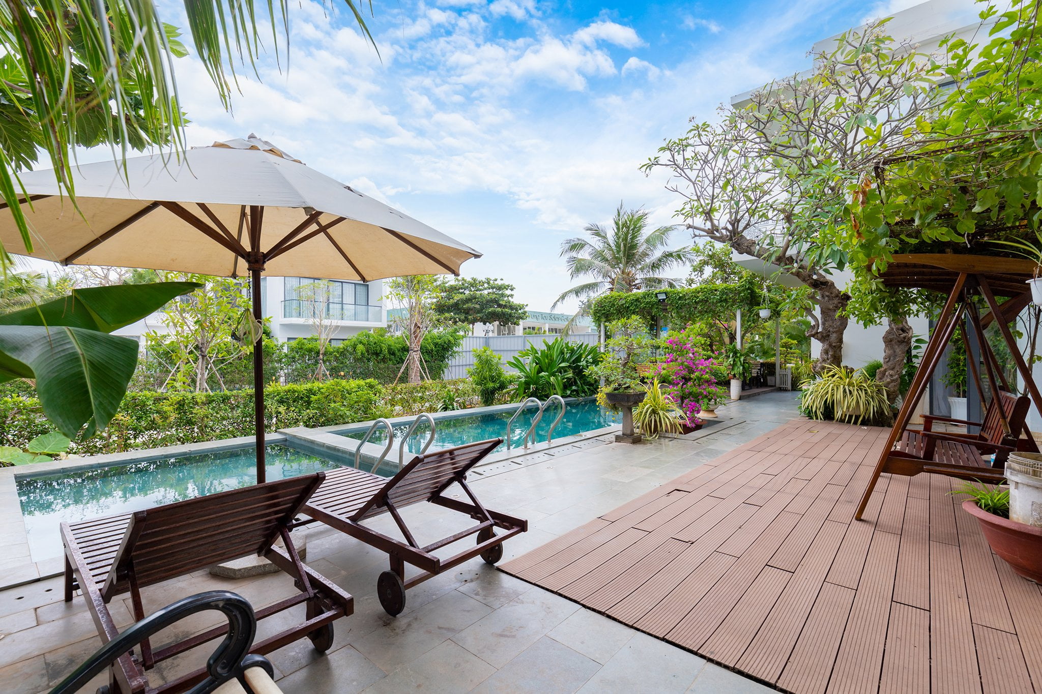Không gian sân vườn xanh mát, hồ bơi rộng