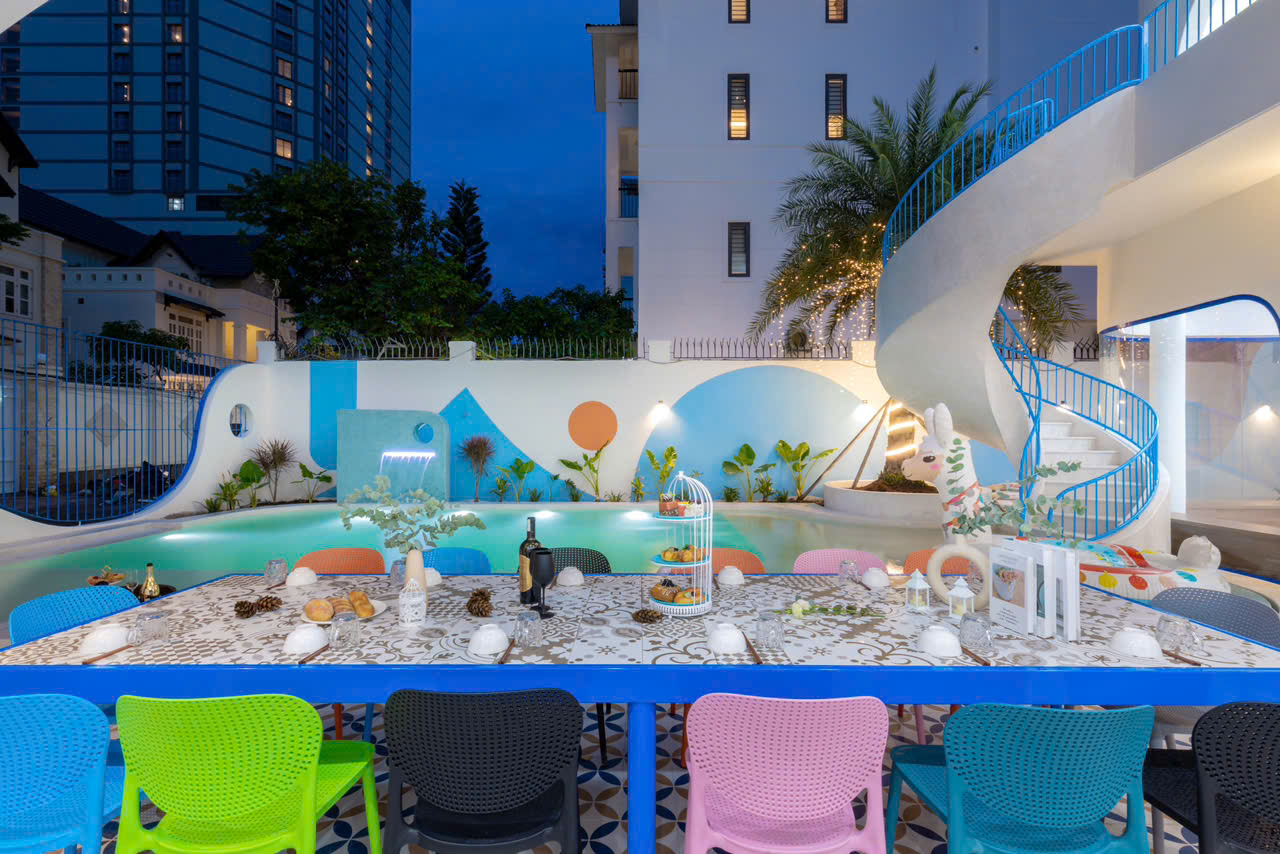 • Không gian làm tiệc BBQ ngoài trời rộng rãi kế hồ bơi, có nhiều góc check in lung linh
