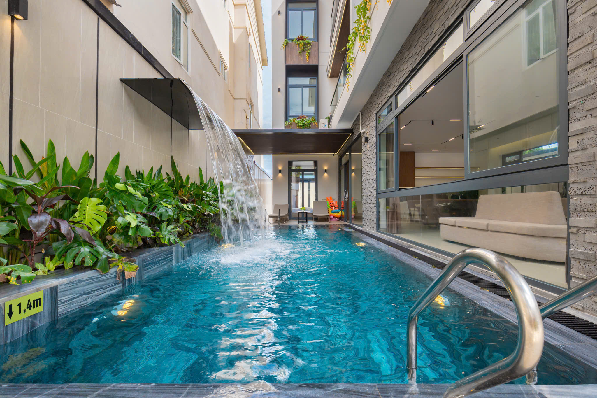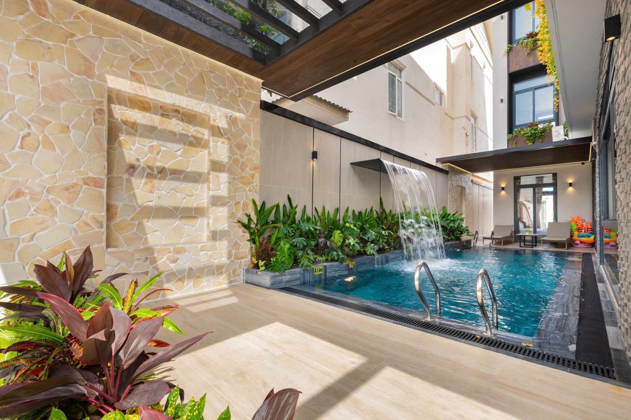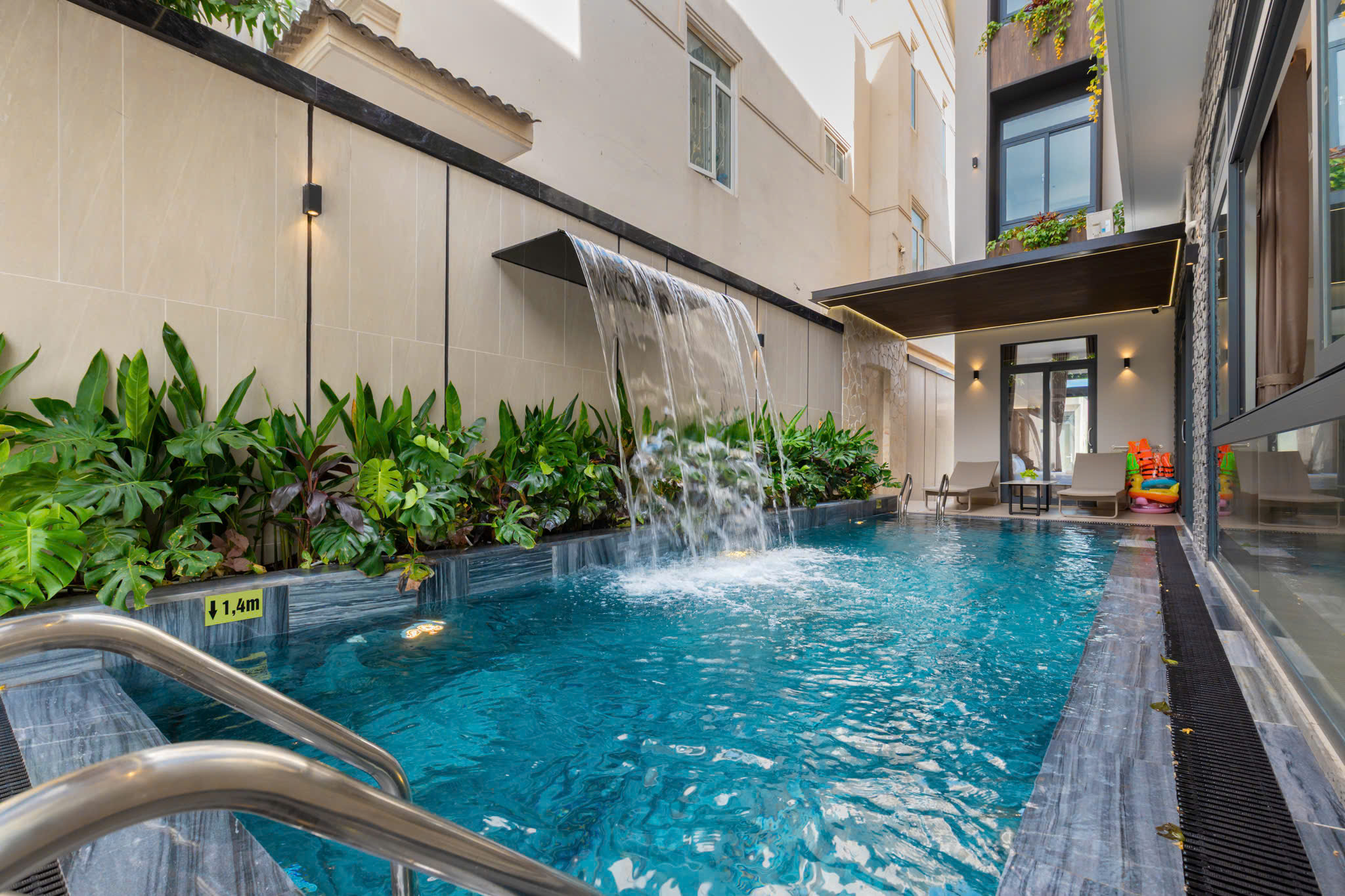 - Hồ bơi: 40m2 NƯỚC MẶN, TỐT CHO DA VÀ SỨC KHOẺ. Hồ bơi có hệ thống đèn LED vào buổi tối và thác nước thư giãn cùng những mảng cây xanh xung quanh.