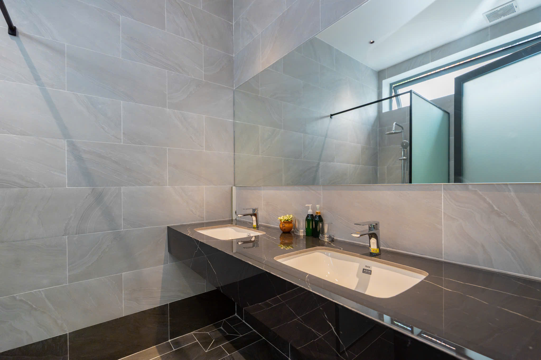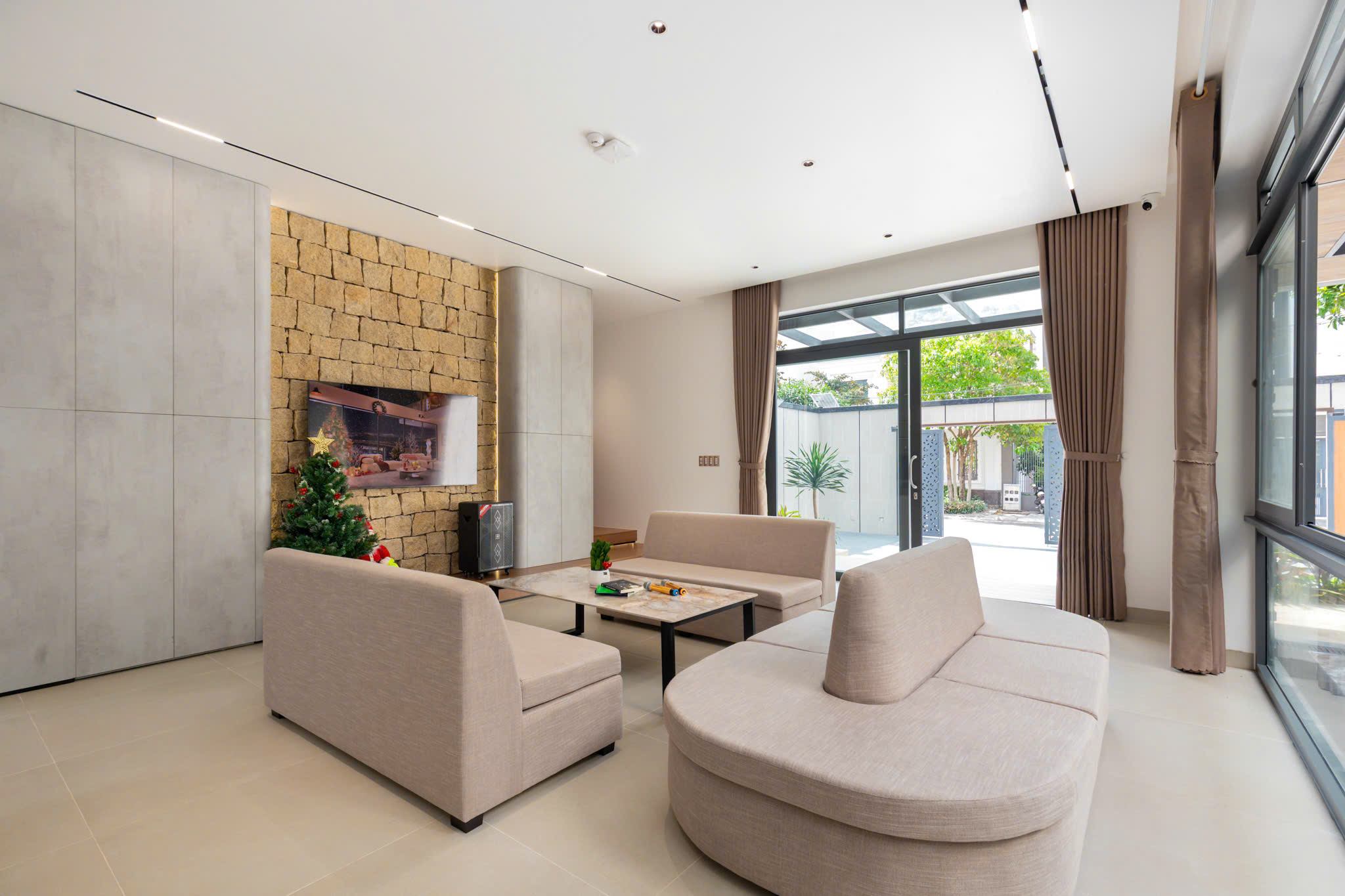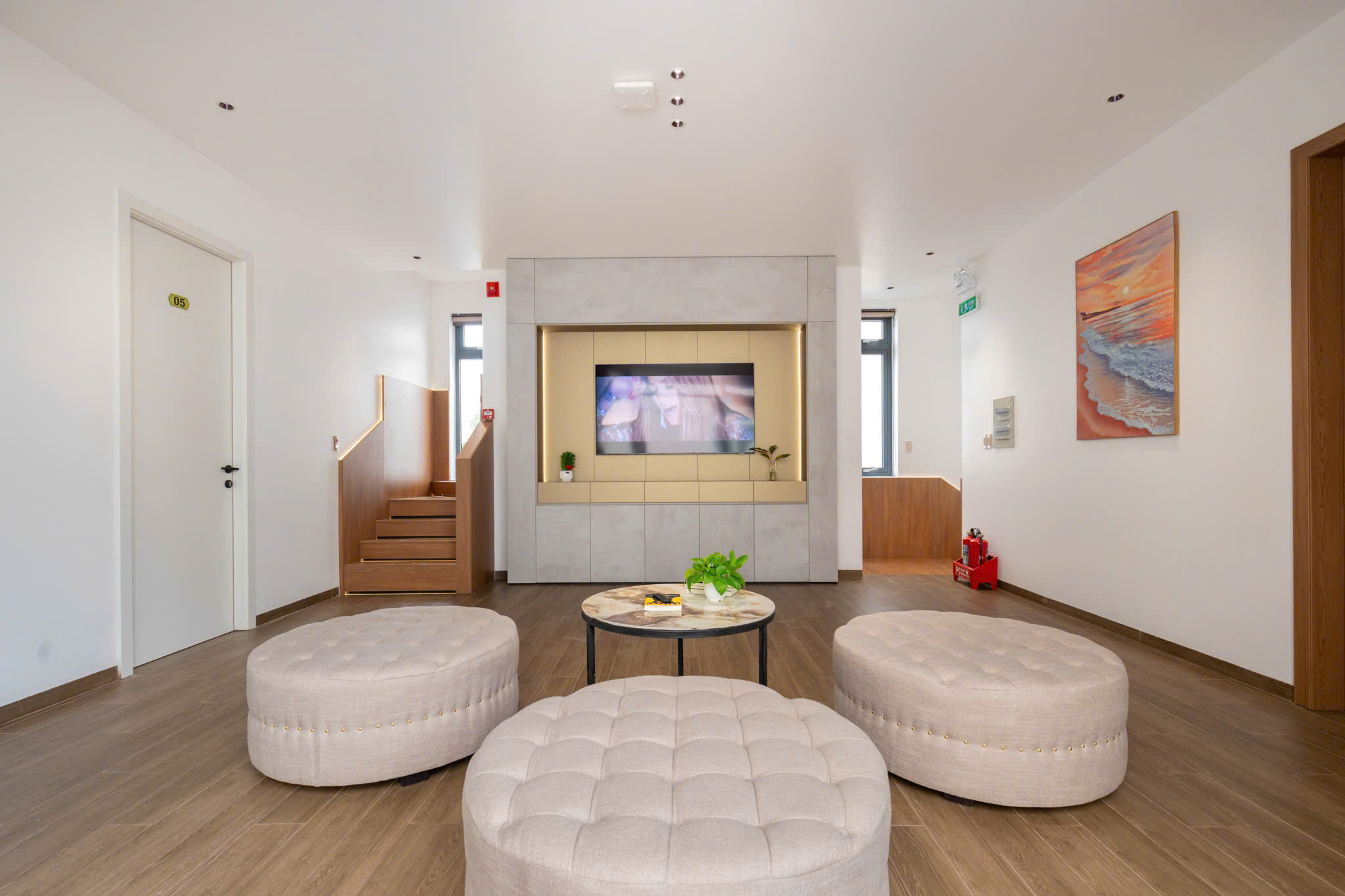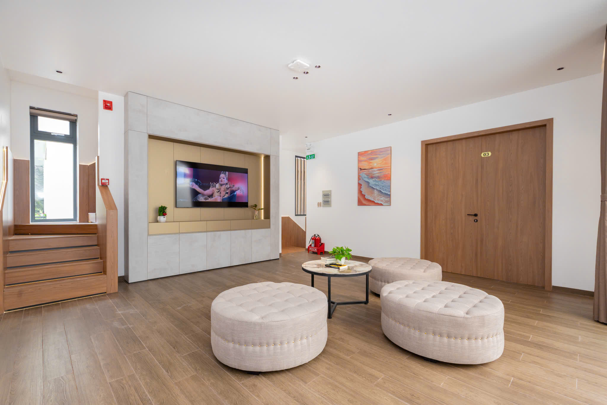 - Tầng 1: 2 phòng 1 giường và 1 phòng Master diện tích lớn, thiết kế cao cấp. Đặc biệt, không gian sinh hoạt chung tầng 1 rộng, trang bị Smart TV – lý tưởng cho xem phim, sum họp
